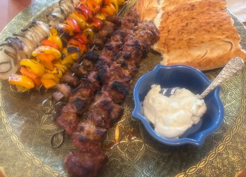 Serve kebabs on platter with flatbread and toum plus ezme and/or hot sauce.