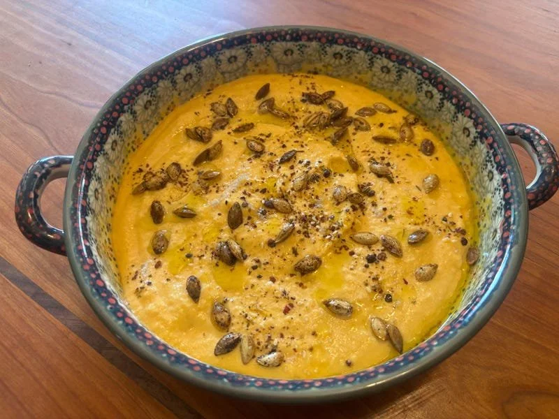 To serve, spread hummus out in a serving vessel and garnish with: crispy squash seeds, sprinkled za'atar, sprinkled sea salt, and a drizzle of good olive oil.