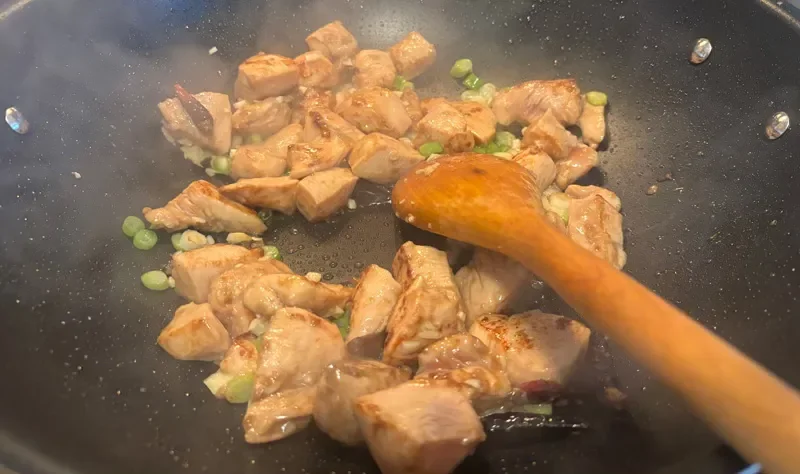 If you’re making rice in a rice cooker, get it started before you even heat your wok. Ideally, the rice and the chicken will finish at about the same time.