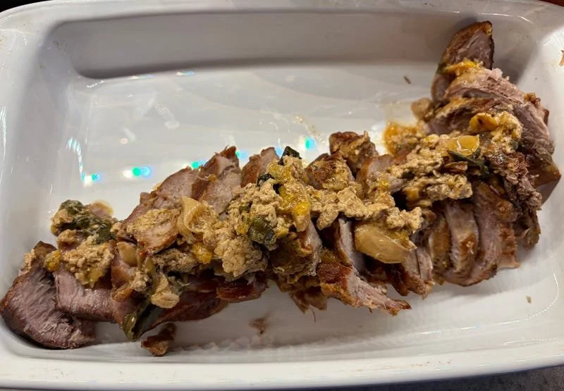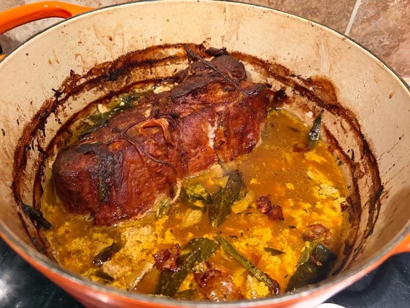 Preheat oven to 300 degrees. Heat a large Dutch oven or heavy and deep saucepan over medium-high, then add olive oil and half of butter. When the butter stops foaming, add the pork and brown on all sides. I set a timer for five minutes per large side to ensure the meat browns undisturbed. Remove pork from pot. Warm garlic, sage, bay leaf, and lemon peel with the rest of the butter in the same pot for a few minutes.