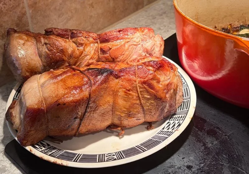 To serve, cut the trussing strings off the pork and slice against the grain into thick pieces. Skim fat from pot if eating immediately. If you make this ahead of time, it’s even easier to skim the fat since the layer of fat will solidify in the fridge overnight and can be removed in pieces the next day. To reheat, place pork in a 300-degree oven until warm.