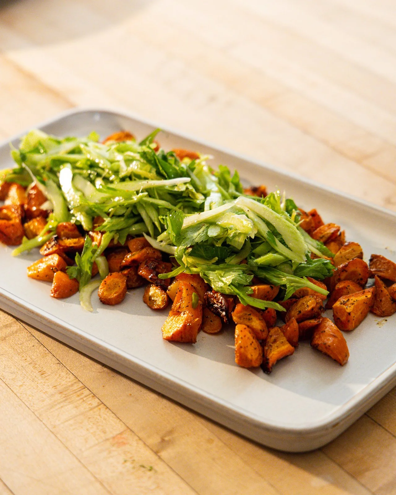 When the carrots are finished, transfer to your serving dish. Toss the celery with the remaining lemon juice, olive oil, salt and pepper to taste - pile the celery salad on top of the warm roasted carrots and serve!