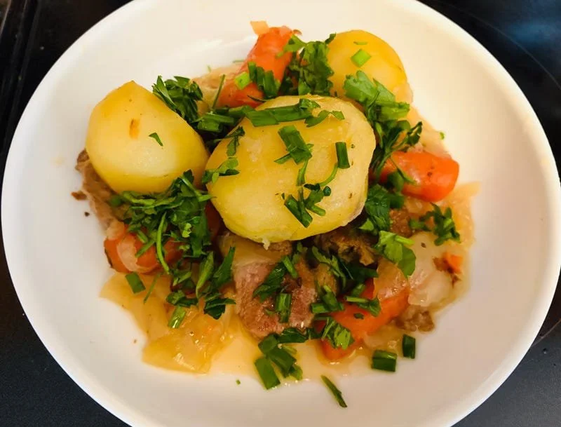 The stew usually improves in flavor if kept for a day or two anyway, so what I do is refrigerate the dish overnight so fat solidifies, then easily pick off the shards of solidified fat the next day and reheat the stew to serve. Garnish with minced chives and parsley. The stew can be served with soda bread, colcannon, or a root puree – maybe even a rutabaga mash.