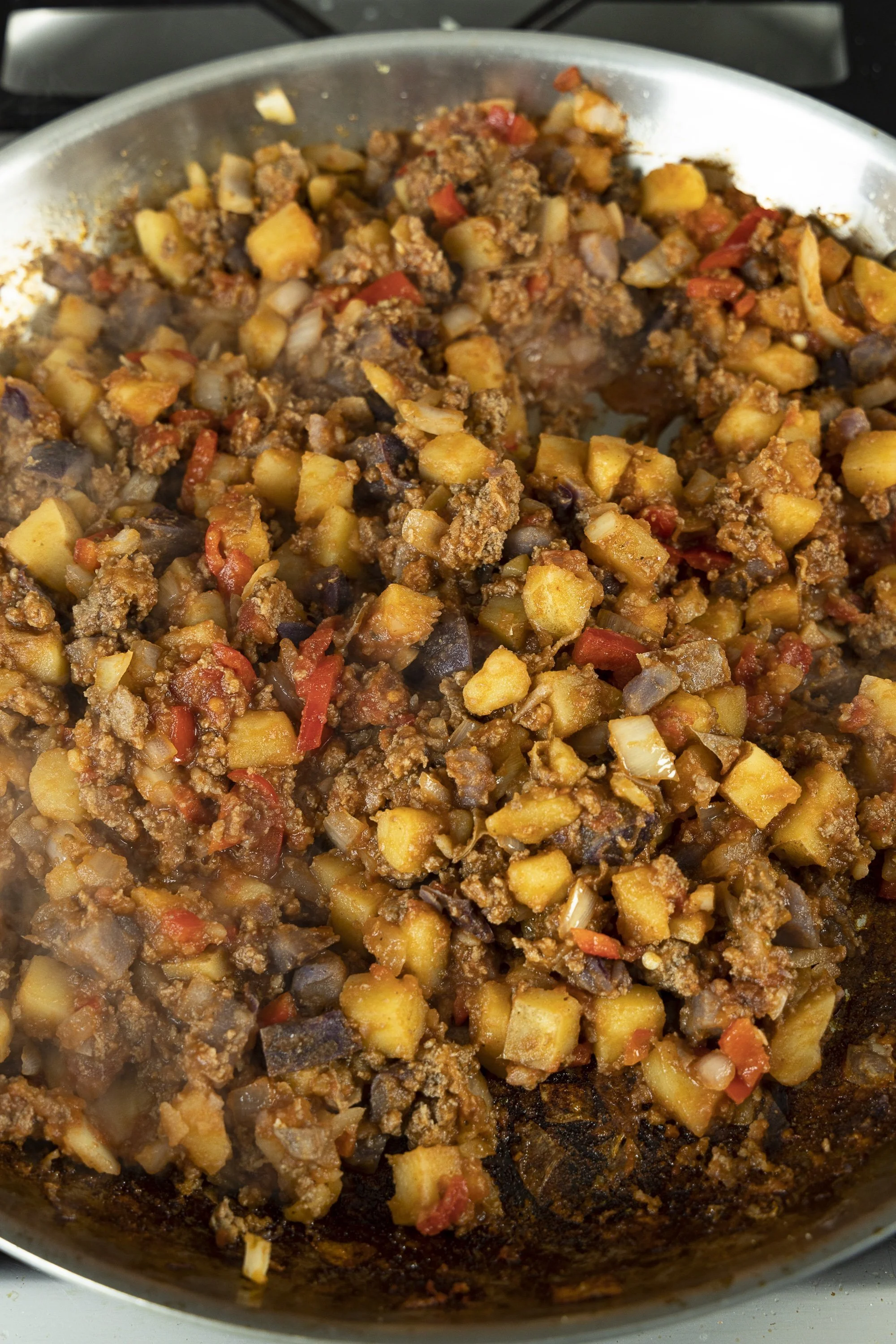 5. Reduce heat and add turkey back. Add in garlic, oregano, tomato sauce, paprika and chili powder. Mix evenly and cook until potatoes are softened.
